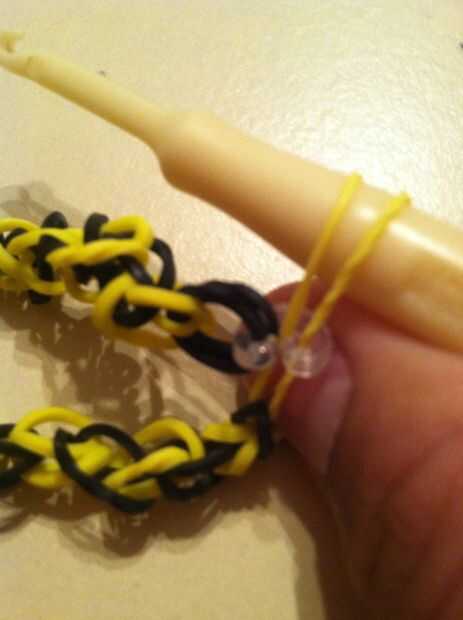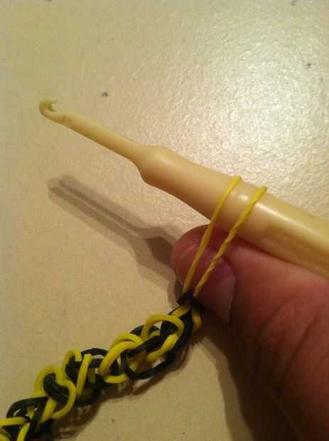 primero lo primero, necesita crear el perímetro de la pulsera, coloque su primera banda de cualquier color y colocar desde el centro a la izquierda y desde el centro a la derecha, así como en la imagen. Luego tomar cualquier banda del color de su ele