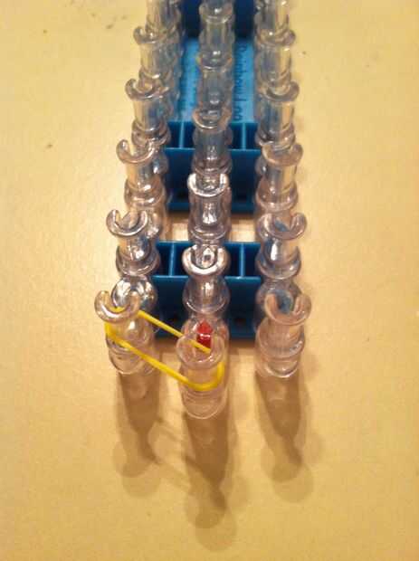 primero lo primero, necesita crear el perímetro de la pulsera, coloque su primera banda de cualquier color y colocar desde el centro a la izquierda y desde el centro a la derecha, así como en la imagen. Luego tomar cualquier banda del color de su ele