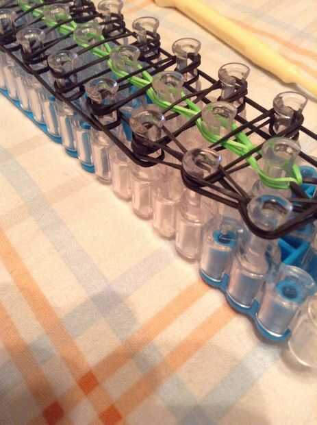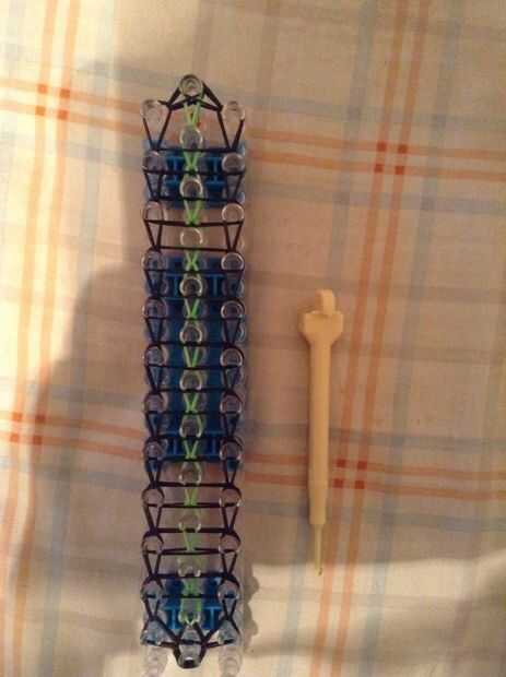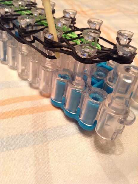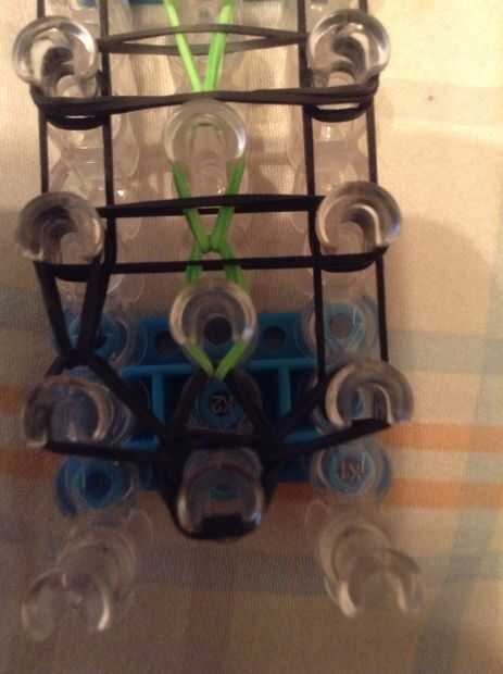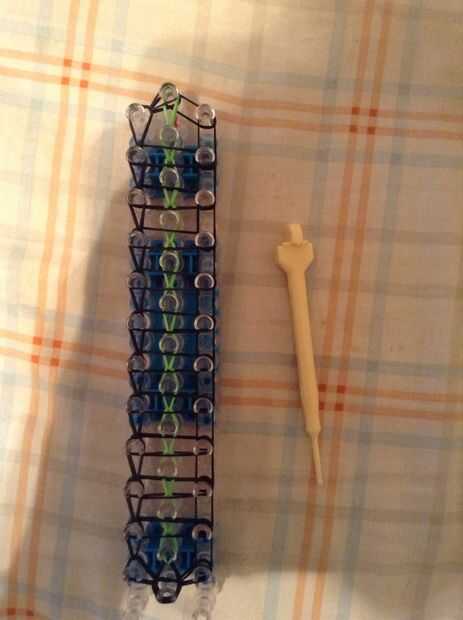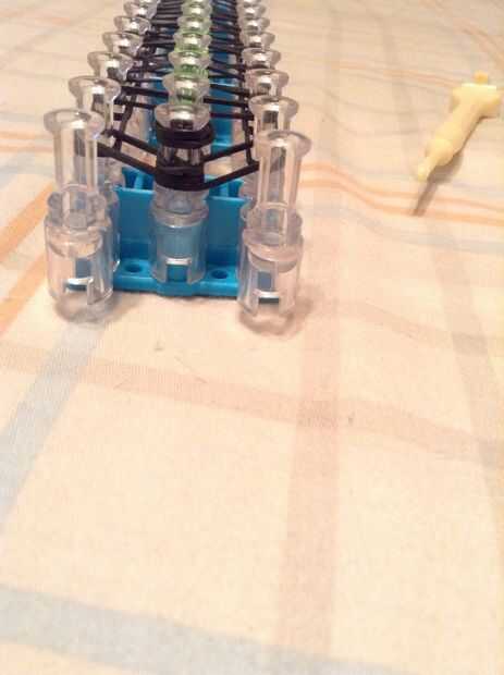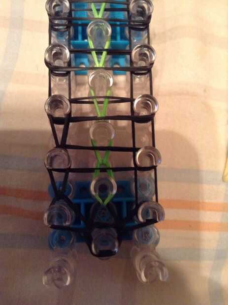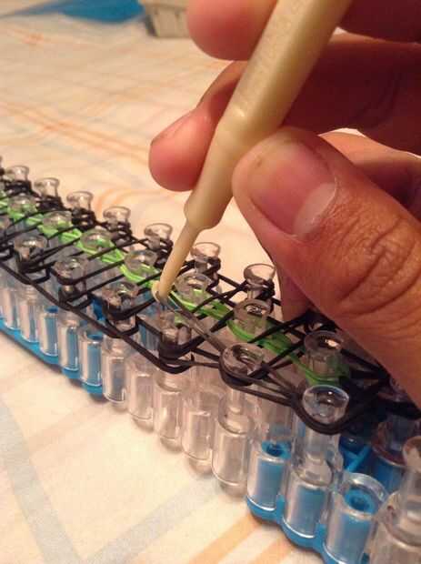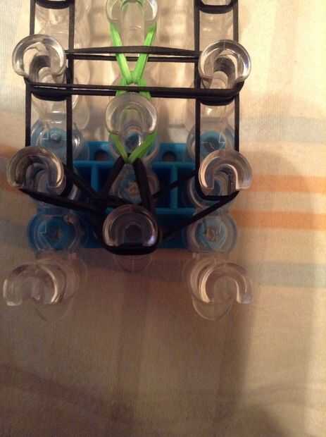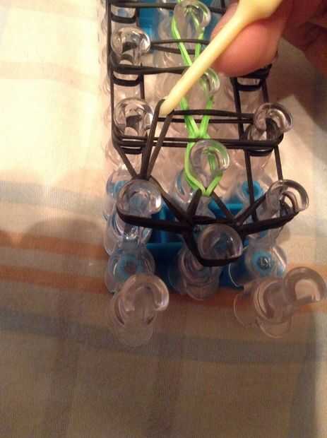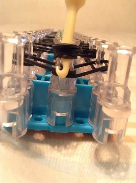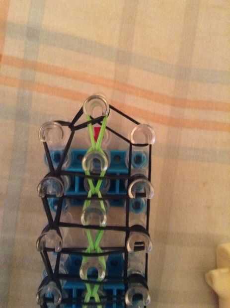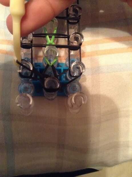 Continuar bucle yendo a la clavija en el lado y deslizar el gancho debajo de las 2 primeras bandas y agarrar la tercera y que con el bucle en la clavija siguiente, así como en la imagen.