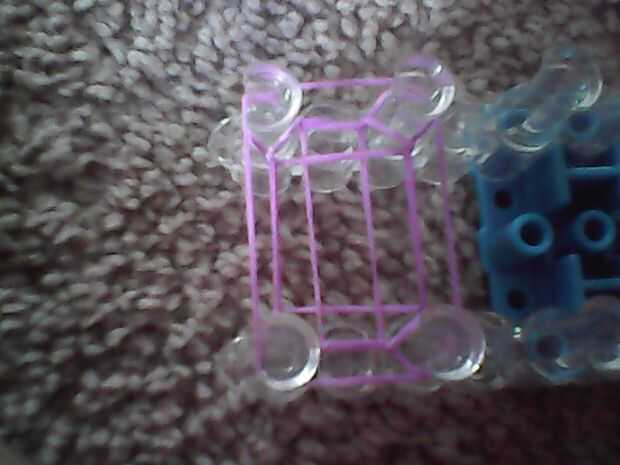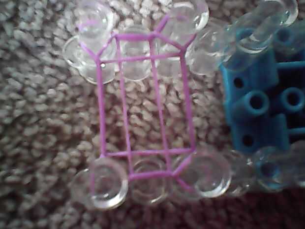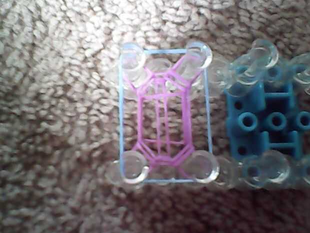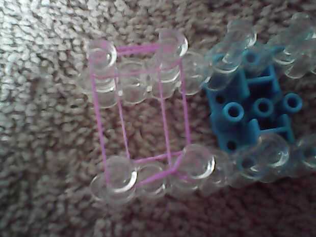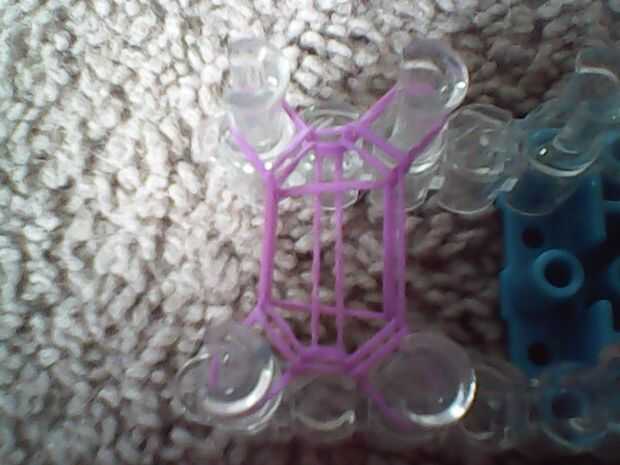 1) agarrar la banda inferior derecha con su gancho y lazo al centro 2) las últimas tres bandas al centro del lazo. 3) Coloque otra banda violeta en las clavijas. 4) las bandas de esquinas 4 parte inferior al centro del lazo otra vez. 5) colocar una banda azul en las clavijas.