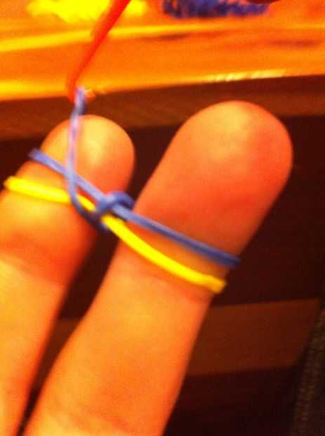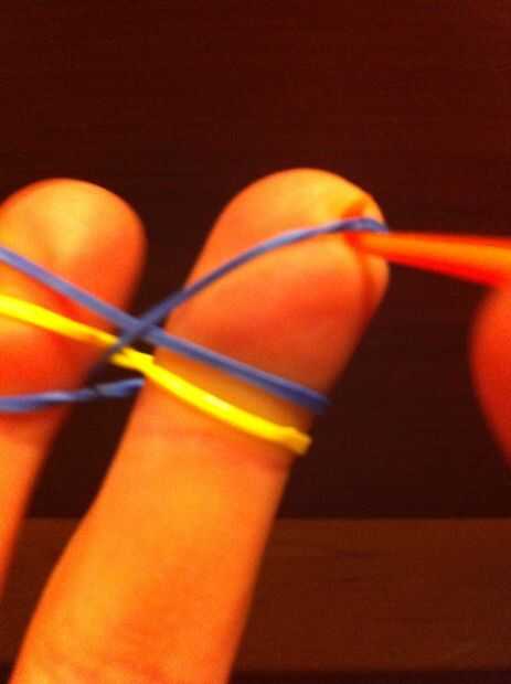primero lo primero, necesita crear el perímetro de la pulsera, coloque su primera banda de cualquier color y colocar desde el centro a la izquierda y desde el centro a la derecha, así como en la imagen. Luego tomar cualquier banda del color de su ele