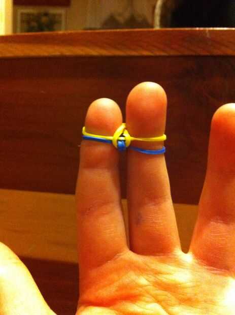 primero lo primero, necesita crear el perímetro de la pulsera, coloque su primera banda de cualquier color y colocar desde el centro a la izquierda y desde el centro a la derecha, así como en la imagen. Luego tomar cualquier banda del color de su ele