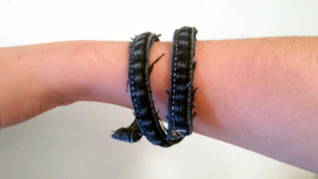 Super impresionante pulsera rah puede llevar donde quiera que vaya!Paso 1: materiales Jeans viejoTijerasHilo y agujaPaso 2: Cortar en tiras Toma tus tijeras y corta tus jeans en tiras de aproximadamente una pulgada de espesor. Asegúrese de que usted
