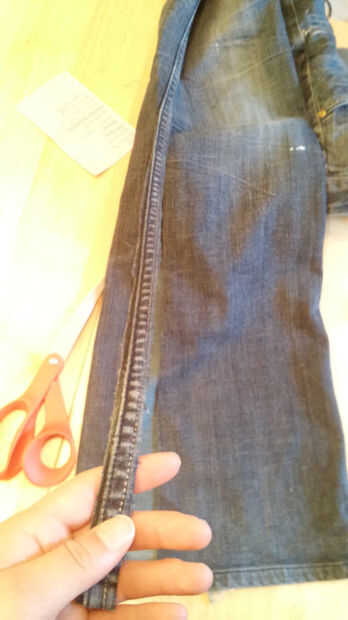 Empecé por cortar la costura de una de las piernas de jean. Esto hará que el cuerpo de la pulsera.