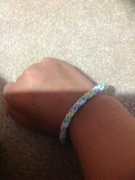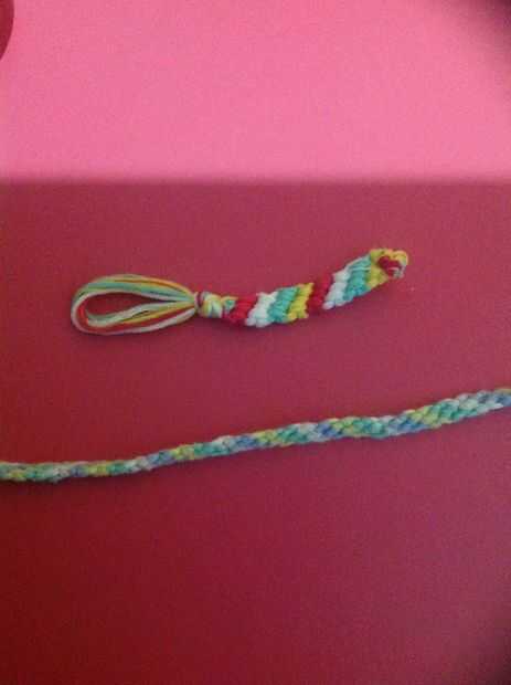una pulsera bastante sencillo que sólo requiere 1 nudo.  Utilicé 4 colores (1 azul, rojo 2, naranja 3, amarillo 4) pero se puede elegir en cualquier lugar entre 3-8 colores.Materiales que necesitas:-Cadena (a veces llamada seda en tiendas de artesaní