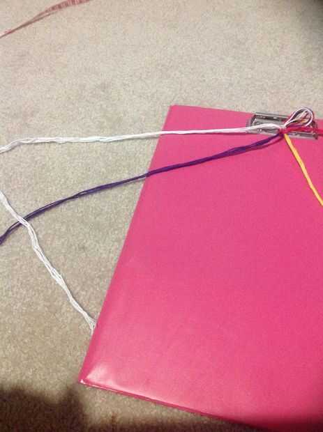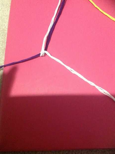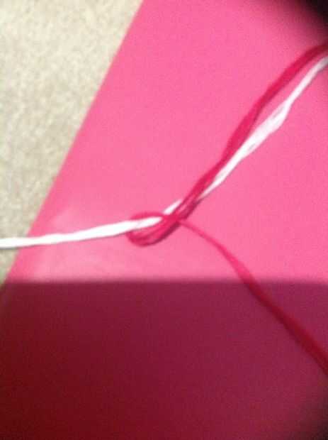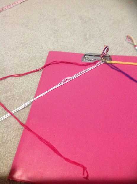 Tomar su primer color y hacer 2 nudos a través de todas las cadenas de color 4 y tire firmemente hacia arriba tome su color siguiente y hacer lo mismo luego hacerlo para todos los colores hasta que hayas alcanzado el primer color