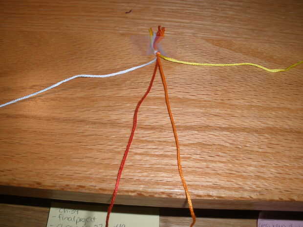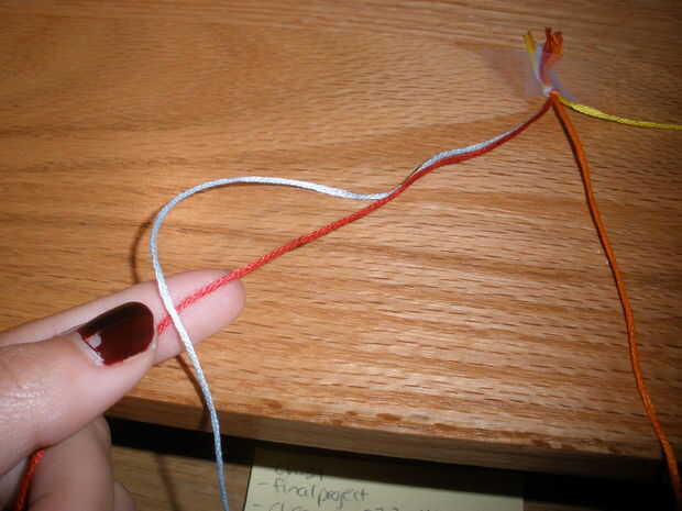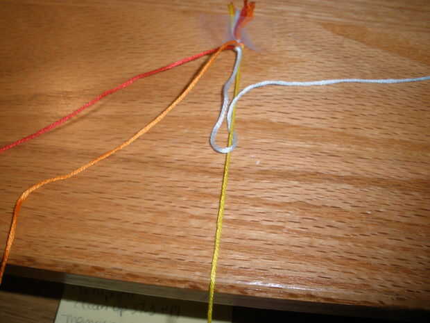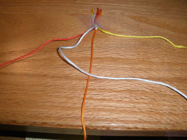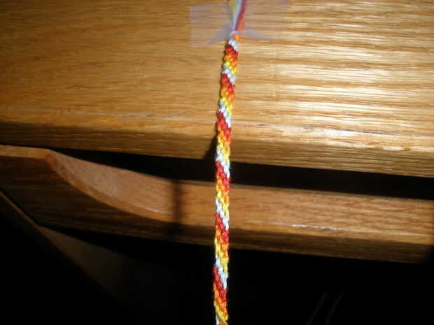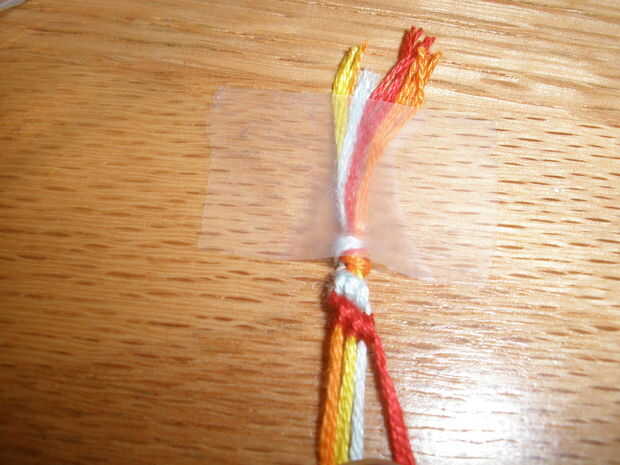 una pulsera bastante sencillo que sólo requiere 1 nudo. Utilicé 4 colores (1 azul, rojo 2, naranja 3, amarillo 4) pero se puede elegir en cualquier lugar entre 3-8 colores. Materiales que necesitas: -Cadena (a veces llamada seda en tiendas de artesanía) -Tijeras -Cinta