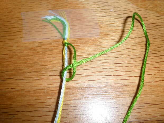 una pulsera bastante sencillo que sólo requiere 1 nudo.  Utilicé 4 colores (1 azul, rojo 2, naranja 3, amarillo 4) pero se puede elegir en cualquier lugar entre 3-8 colores.Materiales que necesitas:-Cadena (a veces llamada seda en tiendas de artesaní