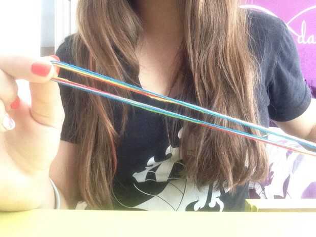 una pulsera bastante sencillo que sólo requiere 1 nudo.  Utilicé 4 colores (1 azul, rojo 2, naranja 3, amarillo 4) pero se puede elegir en cualquier lugar entre 3-8 colores.Materiales que necesitas:-Cadena (a veces llamada seda en tiendas de artesaní