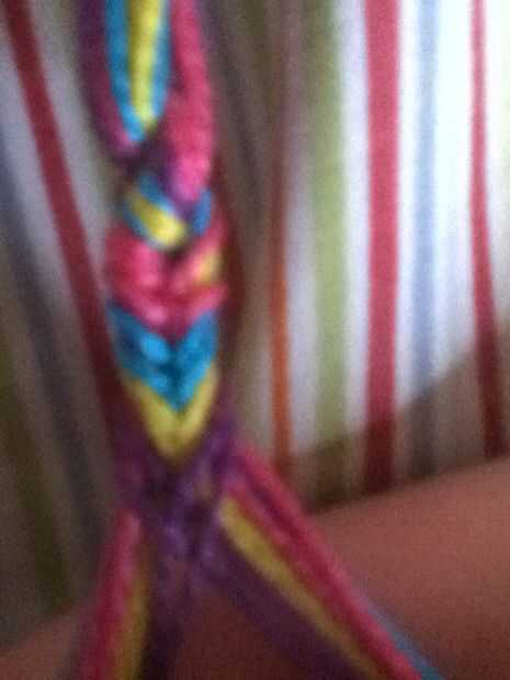 Honestamente, esta pulsera es una simple trenza espina de pescado. Para aquellos de ustedes que no saben cómo espina de pescado es muy simple. Tome un hilo de rosca de la parte posterior de la izquierda por la mitad y darle la parte delantera de la derecha la mitad. Repita al otro lado con el mismo color. Es realmente difícil las primeras hileras de colores porque no hay ningún patrón establecido. Una vez que su patrón por su simple, pero un poco tedioso. Así que tiene mucho tiempo en sus manos. Ningún juego de palabras ;)