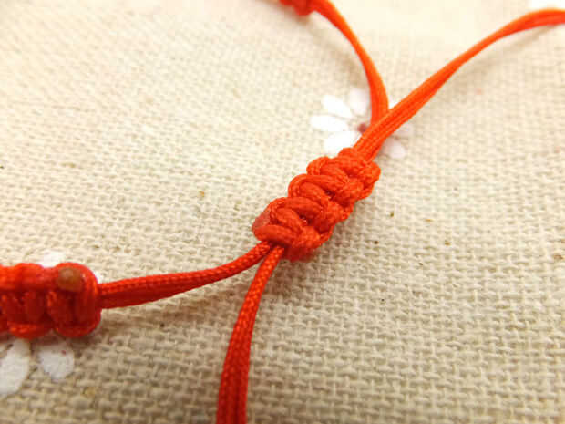 Paso 2: Tome otra cuerda roja para iniciar el trenzado con nudo cuadrado que está diseñado para asegurar que la pulsera no se resbaló y se puede ajustar para aplicar diferentes muñecas con diverso tamaño.