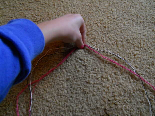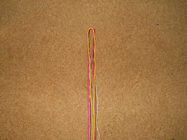 Con las cuerdas en orden antes de hacer el nudo ayuda a con el orden y hace más fácil empezar tu pulsera. El orden va A, B, entonces C. Entonces doble las cadenas por la mitad. Después, doble la gruesa secuencia por la mitad y poner los dos juntos. Atar un lazo en la parte superior. Ver las fotos para más detalle.