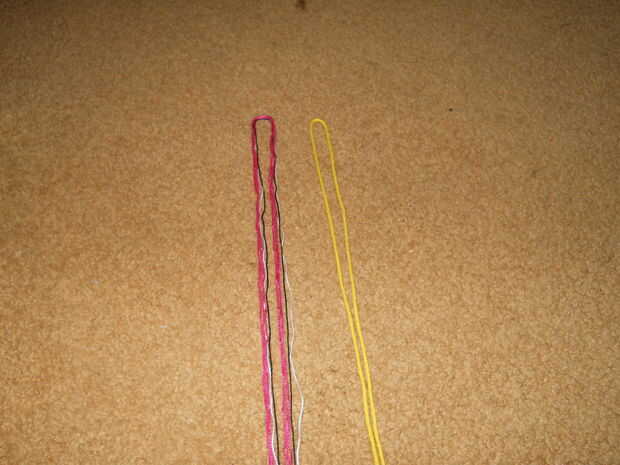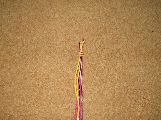 una pulsera bastante sencillo que sólo requiere 1 nudo. Utilicé 4 colores (1 azul, rojo 2, naranja 3, amarillo 4) pero se puede elegir en cualquier lugar entre 3-8 colores.Materiales que necesitas:-Cadena (a veces llamada seda en tiendas de artesaní