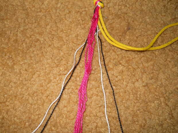 una pulsera bastante sencillo que sólo requiere 1 nudo.  Utilicé 4 colores (1 azul, rojo 2, naranja 3, amarillo 4) pero se puede elegir en cualquier lugar entre 3-8 colores.Materiales que necesitas:-Cadena (a veces llamada seda en tiendas de artesaní