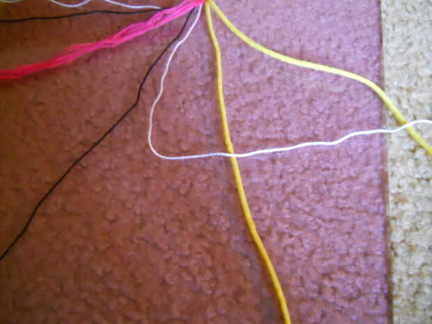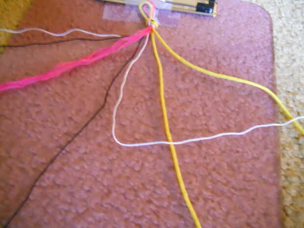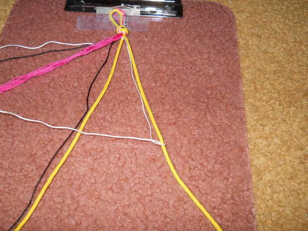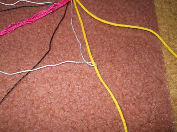 una pulsera bastante sencillo que sólo requiere 1 nudo. Utilicé 4 colores (1 azul, rojo 2, naranja 3, amarillo 4) pero se puede elegir en cualquier lugar entre 3-8 colores.Materiales que necesitas:-Cadena (a veces llamada seda en tiendas de artesaní