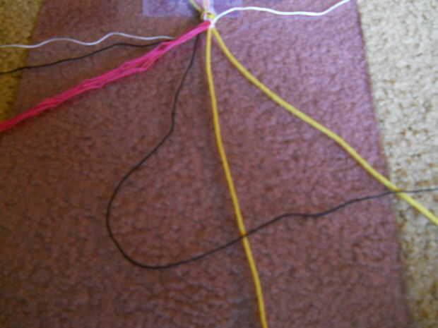 Paso 1: cadena Se necesitan 4 trozos de igual tamaño de cadena, cinta y las manos. (Jajaja :)) Enseñará cómo hacer pulseras de la amistad muy simple!Paso 2: El proceso de Luego tomar las 4 cuerdas y organizarlos en una línea (imagen 4). La primera ca