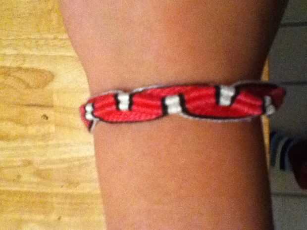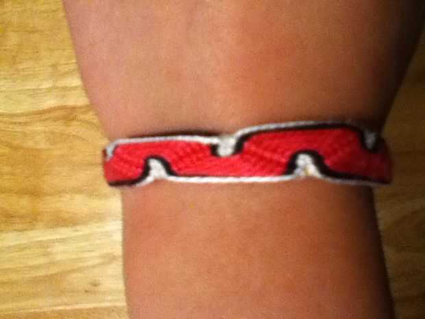 una pulsera bastante sencillo que sólo requiere 1 nudo. Utilicé 4 colores (1 azul, rojo 2, naranja 3, amarillo 4) pero se puede elegir en cualquier lugar entre 3-8 colores.Materiales que necesitas:-Cadena (a veces llamada seda en tiendas de artesaní
