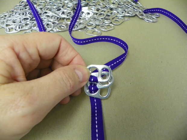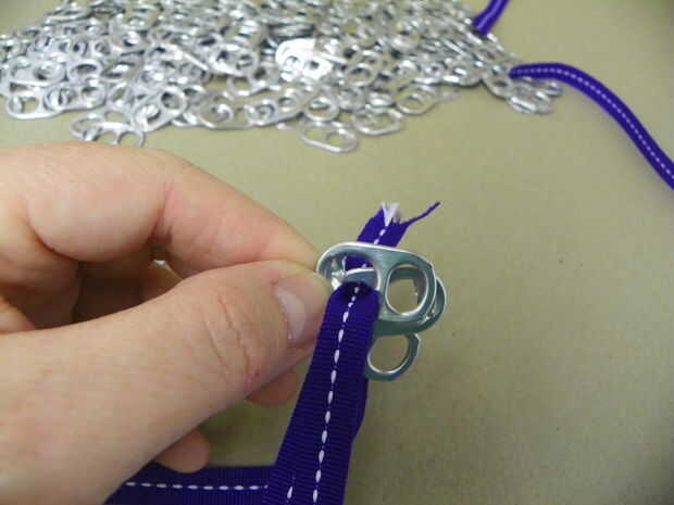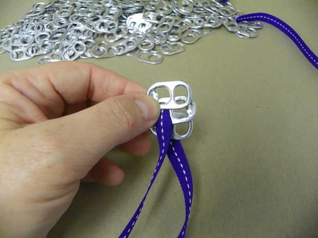Empuje el extremo puntiagudo de la cinta por los agujeros del lado izquierdo de las segunda y 3 tapas pop. Tire firmemente hacia atrás.