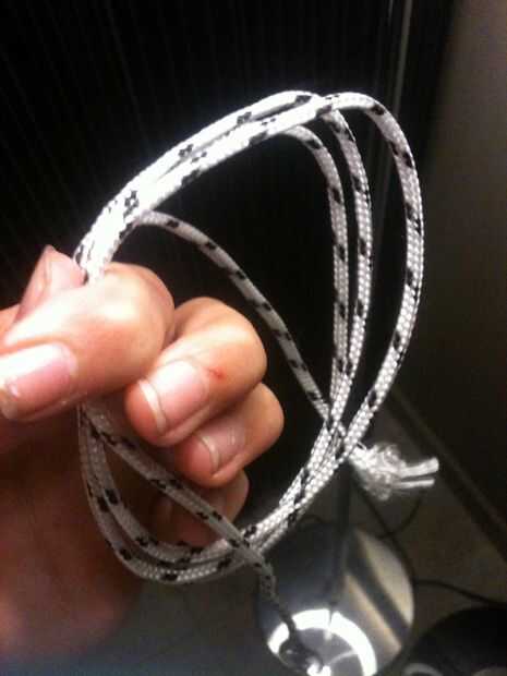 Obtener una longitud de cuerda de cable o la utilidad de para, cerca de 3m de largo y 3mm creo y lazo uno terminan tres veces alrededor. Hacerlo sobre el tamaño de tu puño así puede caber holgadamente. Deje unos 4cm en un extremo y el resto en el otro.