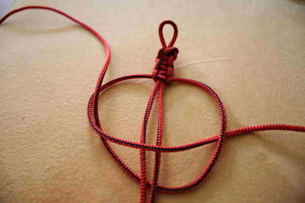 Tome la cuerda izquierda y colóquela sobre el lazo grande y bajo la cadena de diestra. Tome la cuerda derecha, pone bajo el gran bucle y a través del lazo hizo con la cadena para zurdos. Asegúrese de que tire la cuerda derecha de abajo hacia arriba a través del bucle y no de la parte superior hacia abajo.