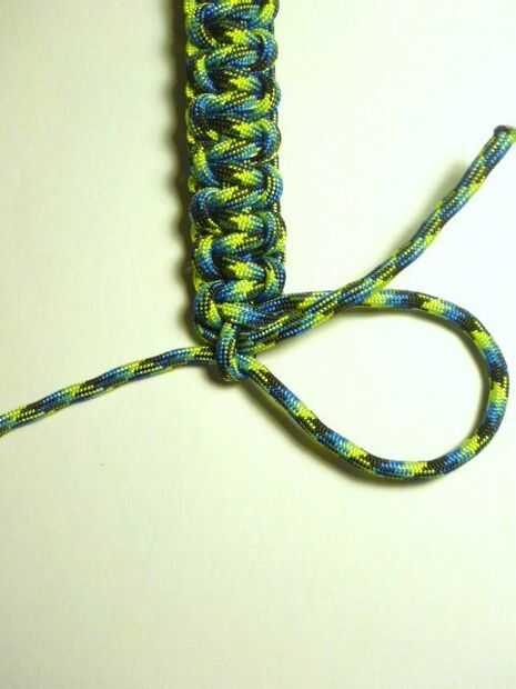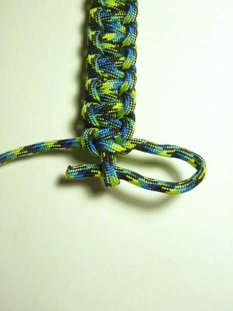 Desconecte el peso y el carabinero. Alimentan el cordón derecho a través del pequeño lazo y tire firmemente. Voltee la pulsera y lo mismo con la izquierda. Esto termina un extremo sin el uso de nudos bulgy.