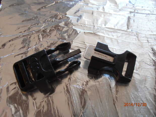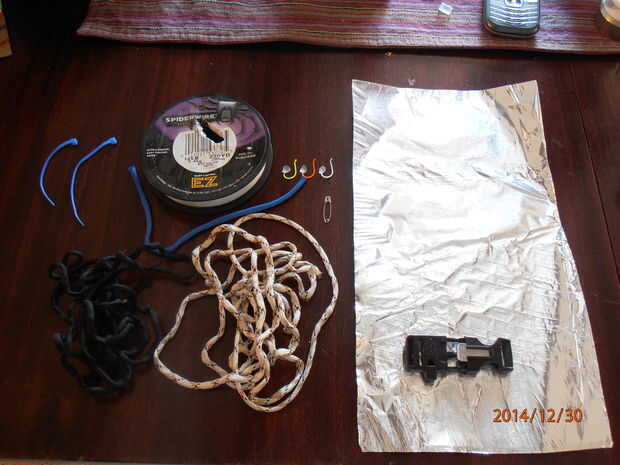 Este kit es probablemente la más mínima se puede obtener con un kit de supervivencia real, debido a su pequeño tamaño. Este kit puede contener realmente cinco o menos artículos de supervivencia en la pulsera. Que poner un trozo de papel de aluminio 4 x 4, 3 ganchos colores (naranja, chartreuse y brillo), un perno de seguridad, cerca de 20 pies de 12 lb test sedal, flint / silbato hebilla, 8 pies de paracord negro, 8 pies desierto camo y 6 pulgadas de paracord azul y dos abrazaderas de plástico. También usé un mechero y un par de tijeras para el proyecto. Usted puede encontrar pedernal hebillas aquí.