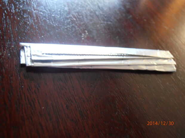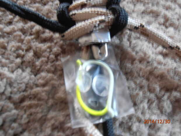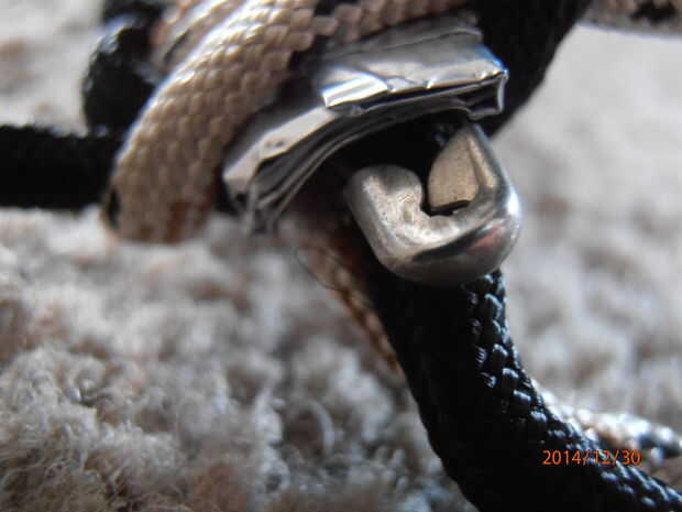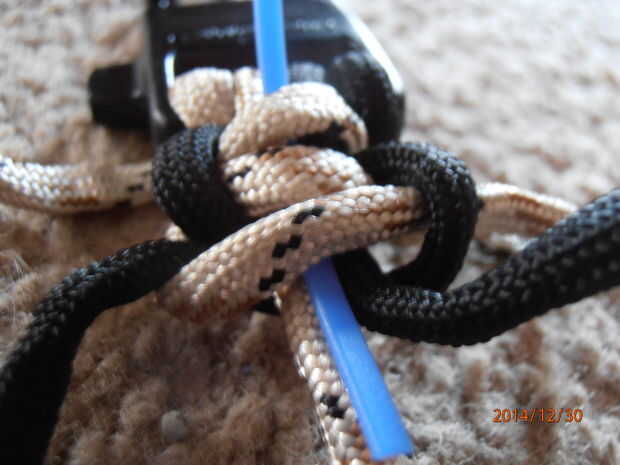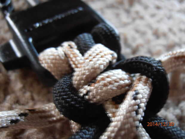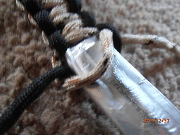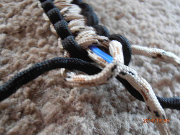 Una vez que ha iniciado, tomar uno de los lazos del cierre relámpago y deslícelo a través de la parte superior. Una vez que se ha trenzado un par veces, tomar la última de ellas y aflojar para arriba y deslice la pieza doblada de papel de aluminio en. Otra vez, después de usted ha trenzado hasta el final de la hoja, afloje la última de ellas y deslice el pasador de seguridad bajo la lámina. Una vez más han trenzado sobre eso, aflojar la última de ellas y deslice los dos ganchos de pesca (grabados juntos) bajo el paracord y comienzo otra vez trenzado. Una vez que ha llegado al final, la pulsera alrededor del tirón y empezar a trenzar, mientras que está trenzado, tomar la pieza azul de paracord y empezar a tejer a través hasta llegar al otro extremo.