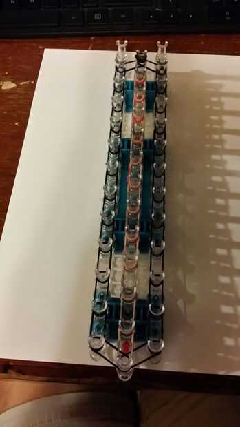 Para tus dos últimas bandas se tire su una banda de la izquierda atacando a la sección media del poste pasado, y hacer lo mismo con su banda a la derecha. Luego se tomar una banda y hacer una figura 8 en la mano en la última sección intermedia del poste.