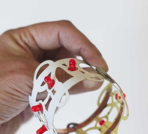 - Establecer la BraceLED en dos piezas de scrapwood (o libros) con una raja entre derecho debajo de los orificios a través de la cual aparecerán los LEDs.
