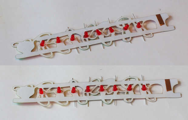 - Poner los LEDs a través de los agujeros de lo braceLED, los cables cruzando los rastros cobre (recordar el tema de la polaridad? :-))
