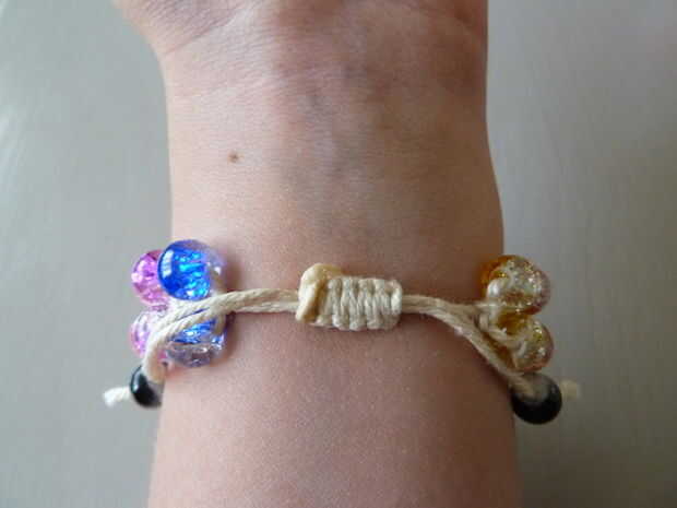 Cortar los hilos que anudado con y pegar a la pieza de doce nudos. Sólo asegúrese de no pegar esta pieza a la base, cuando haces tu pulsera no será modificable en tamaño. También corte el extremo de la base, y la longitud sobre la misma que en el principio. Puede Agregar una cuenta y un nudo aquí, también.