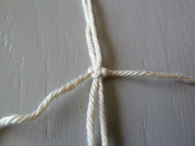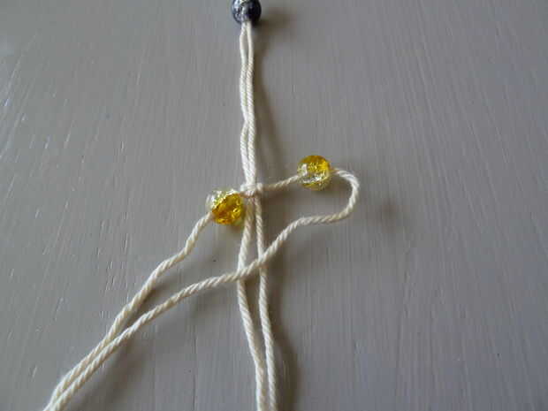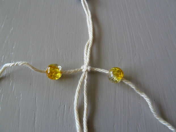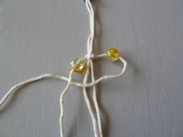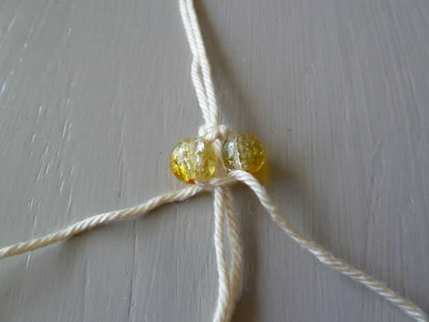 El siguiente nudo es apenas un nudo simple, como se explica en el paso 5. Porque usted acaba de agregar los granos, puede ser difícil saber lo que es la línea vertical, por eso puse una nota de la imagen en la última foto, que muestra lo que la línea vertical parece ahora.