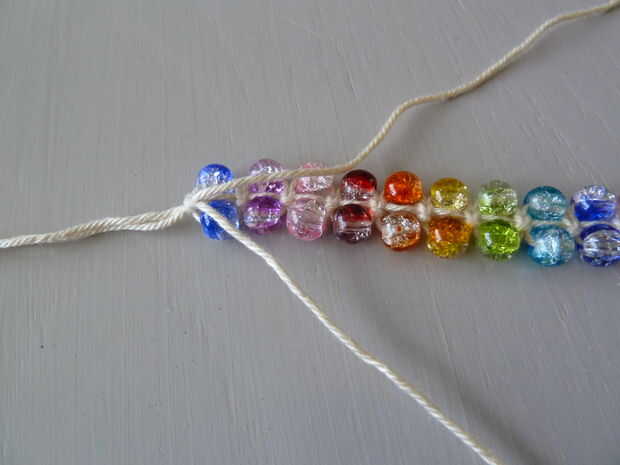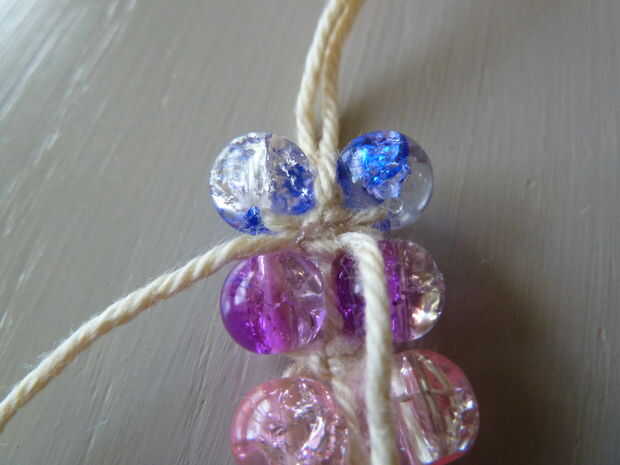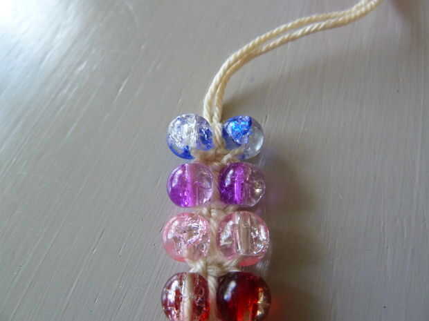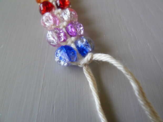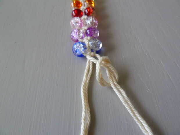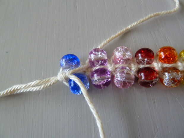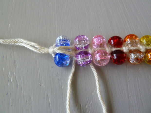 Tomar los dos hilos externos (los largos) y nudo, tan cerca de la pulsera como sea posible. Tomar los hilos y ponerlos a través del nudo de los granos de segunda pasada (sí, usted debe mirar las fotos) Vuelta a la pulsera y hacer un nudo simple con los dos hilos. Tire firmemente, añadir un poco de pegamento y corte los hilos.