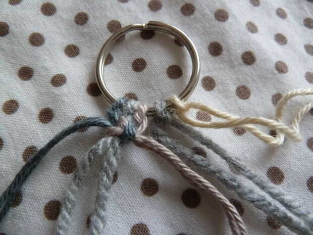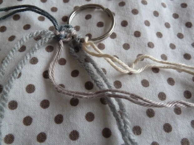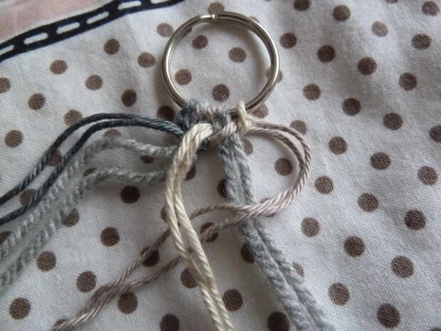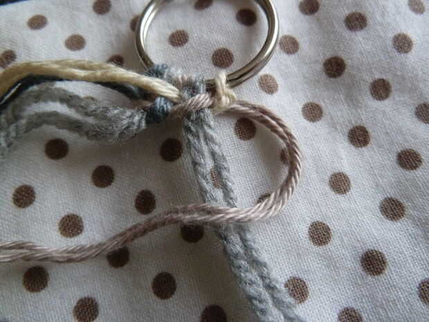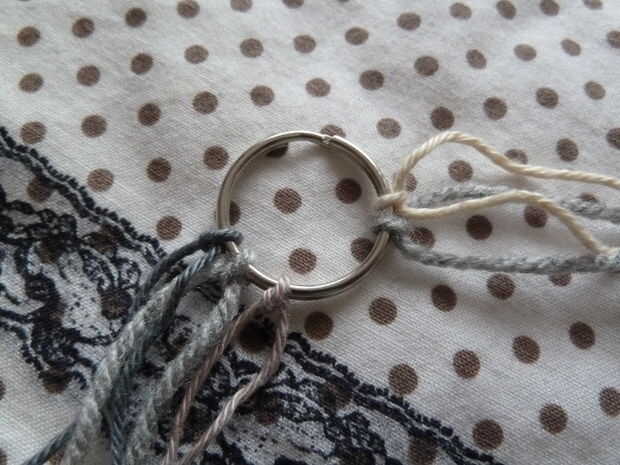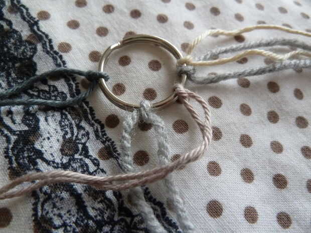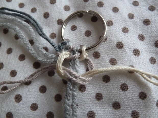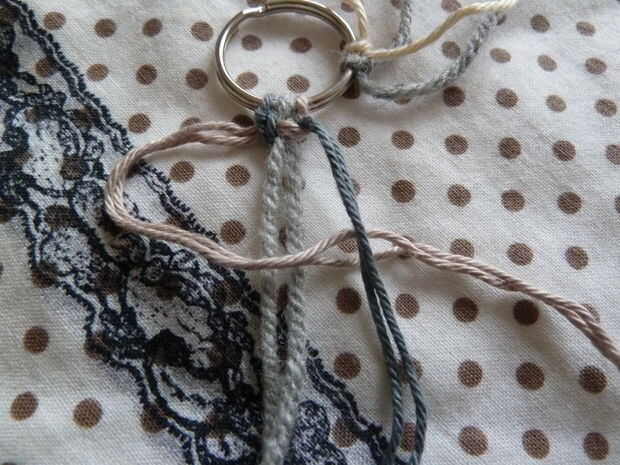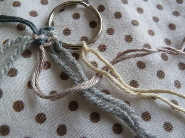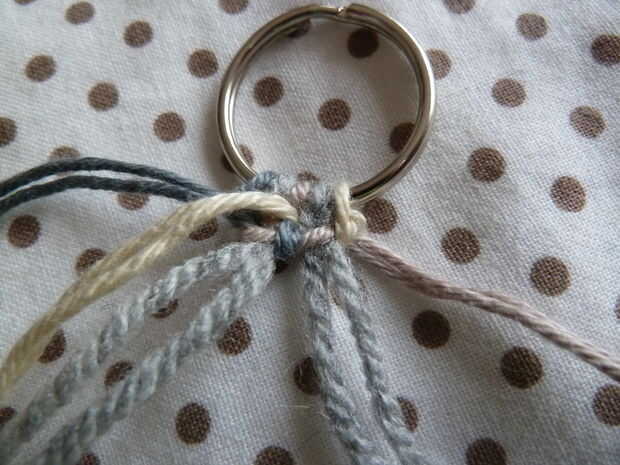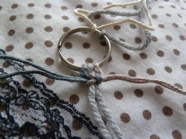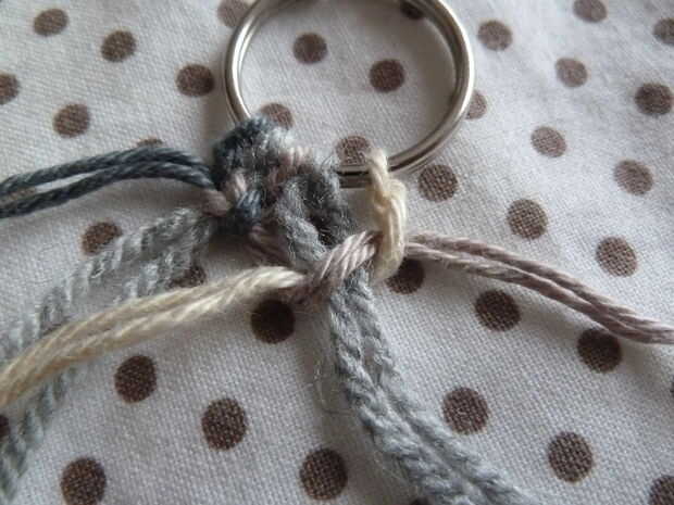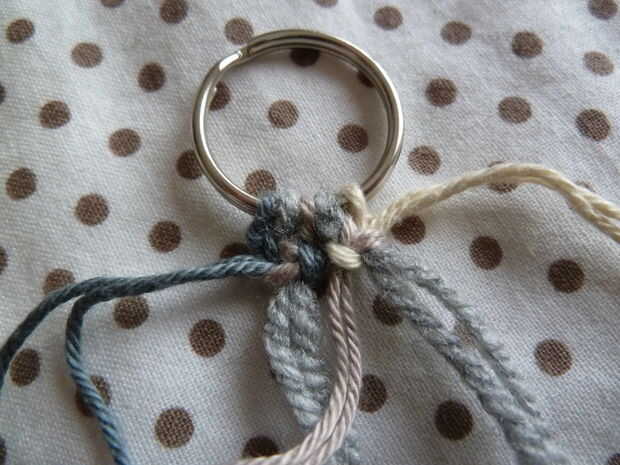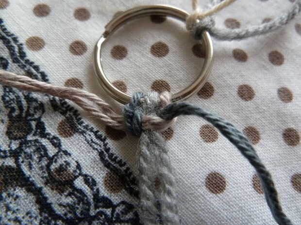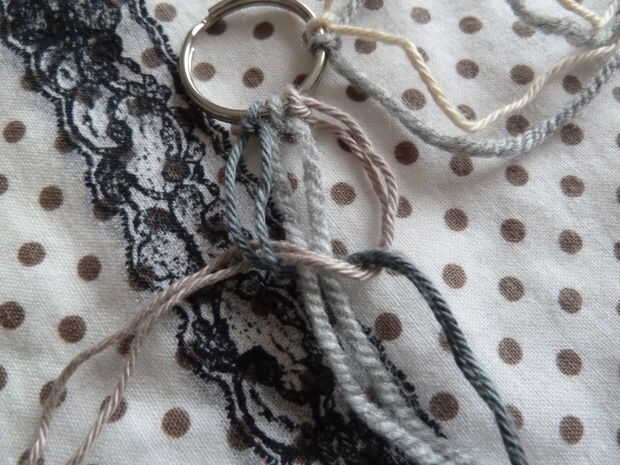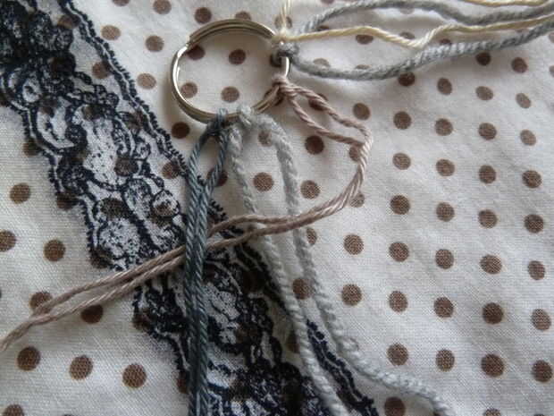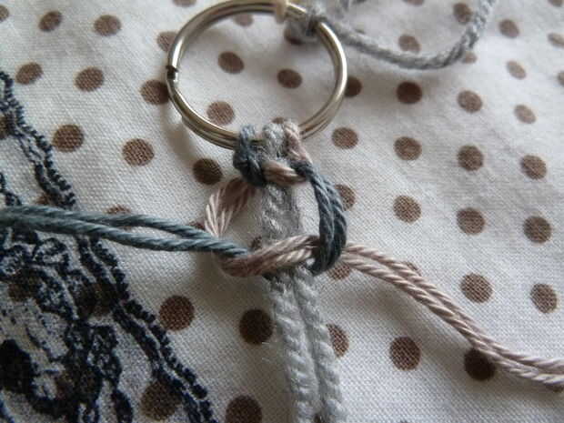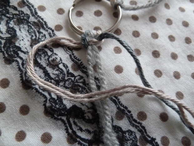 Tomar su interior color (dos filamentos) y ponerlo sobre las hebras grises. A continuación, tomar su color exterior y ponerla sobre el interior color. Deje que el color exterior ir por debajo de los hilos gris y lo suben a través del espacio entre los filamentos del gris y el interior filamentos (he demostrado esto con una nota de la imagen). Tire de ambos hilos fuerza para terminar el nudo.