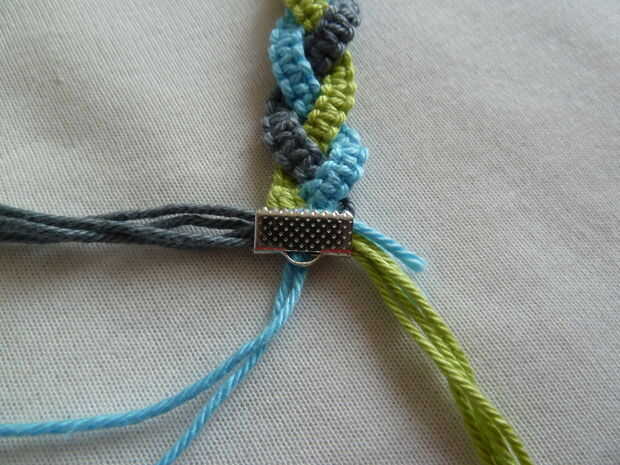 Poner los hilos de la parte de macrame medio hacia abajo y el otros a los lados. Deja que ir a los dos hilos largo de la parte media de macrame a través del segundo prensado de cable por ellos anudar primero junto, entonces anudar un filamento adicional para el solo lazo y tirando de ese hilo a través de la encrespadura de cable. Que la izquierda hilos pasan por el cable engarzado a la derecha como se muestra y la derecha a la izquierda. Cerca de la encrespadura del cable para evitar que la pulsera unbraiding.