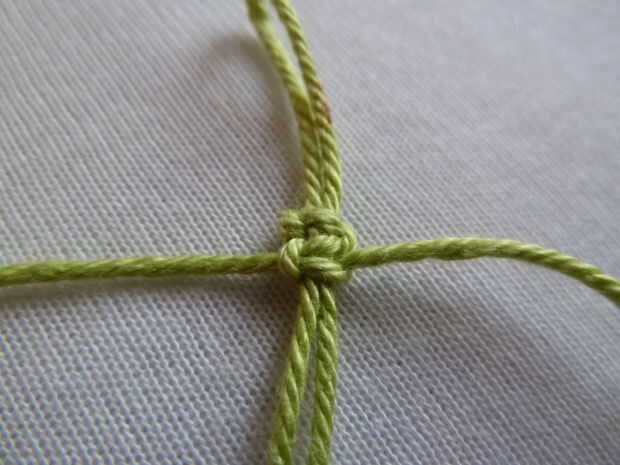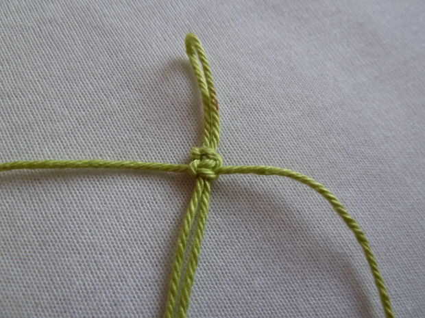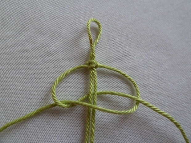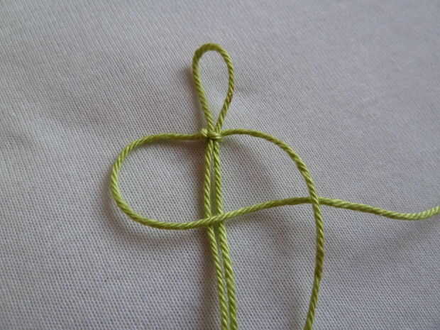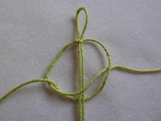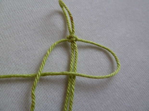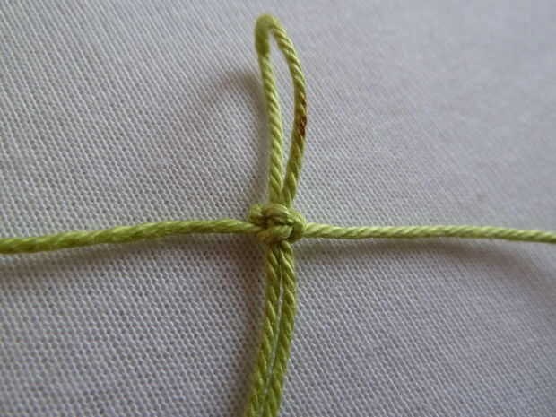 En esta parte, poner el hilo largo en el centro, luego continuar del mismo modo que la última vez pero reflejado: en lugar de comenzar por poner el hilo de la derecha sobre los filamentos del mediados ya pones el hilo de la izquierda. A continuación poner la parte derecha del largo hilo sobre el hilo de izquierda, bajo los dos hilos de mediados y respaldo a través de ese lazo, que ahora se encuentra a la izquierda en lugar del derecho.