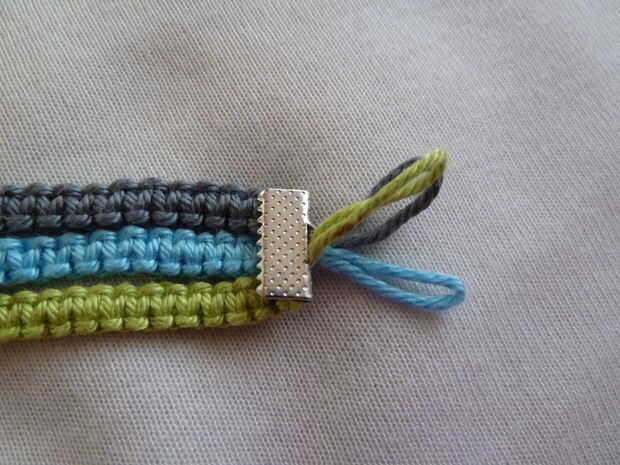 Hay también una segunda opción para agregar las piezas de macrame para el prensado de cable, que es ligeramente diferente. Comience poniendo el hilo en parte, a través de la encrespadura de cable entonces nudo la parte de macrame a él y tire de ella hacia arriba. Es un poco más fácil añadir el hilo desde la parte superior de la cuerda de la encrespadura en vez de desde el fondo, como lo hice en el último paso. Para la última parte de macrame, yo vuelta el cable engarzado y había añadido a la parte posterior, ya estaba todavía vacía.