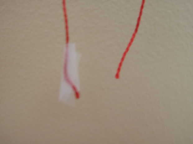 Ahora debe tener dos hilos de rosca corta lastrados por las tijeras con un largo hilo en cada lado. Marca de la izquierda "roja" de la secuencia con un pequeño trozo de cinta en el extremo del hilo.