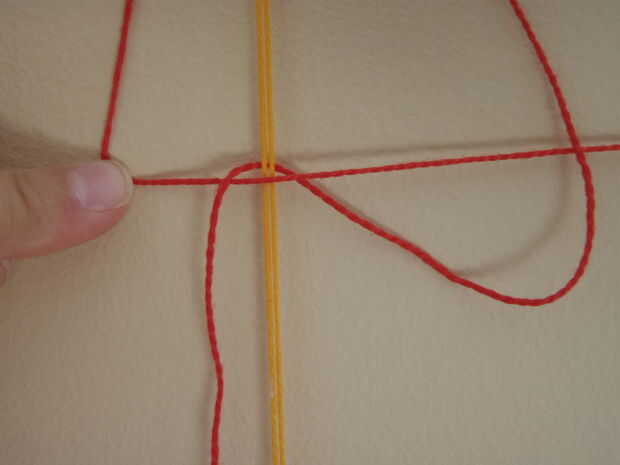 Llevar el hilo de rosca rojo justo detrás de los hilos del centro y en el triángulo de la forma de L en el lado izquierdo. Páselo a través del triángulo por detrás, por lo que están tirando del hilo hacia usted. (Realmente parece más difícil de lo que es realmente fácil, son difícil de tomar una buena foto no confusa)