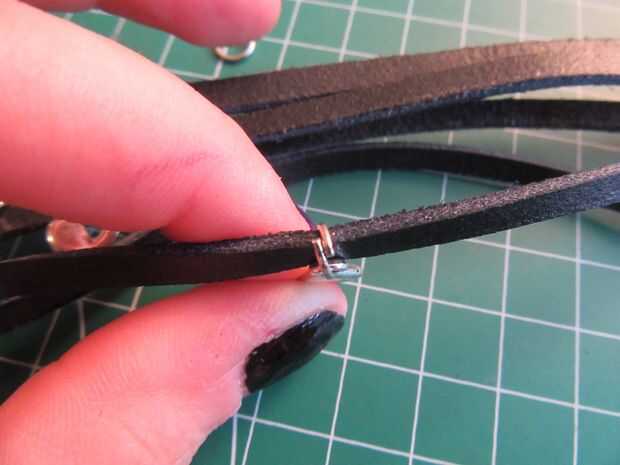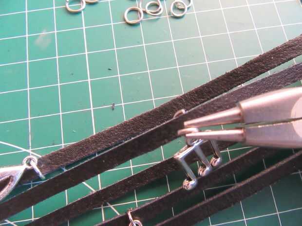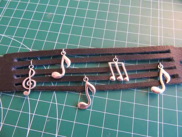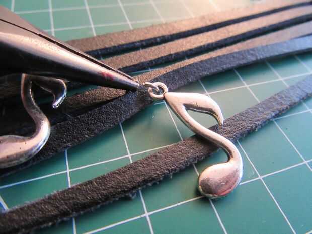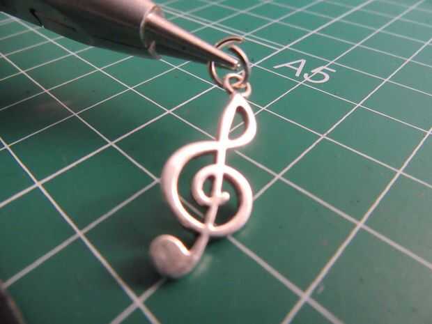 Tome las pinzas. Un encanto y añadir un anillo de saltar a ella. Luego lo cuelgan en la línea de personal, te gusta. La idea es cerrar el anillo salto suficiente para establecer la nota en el lugar deseado.