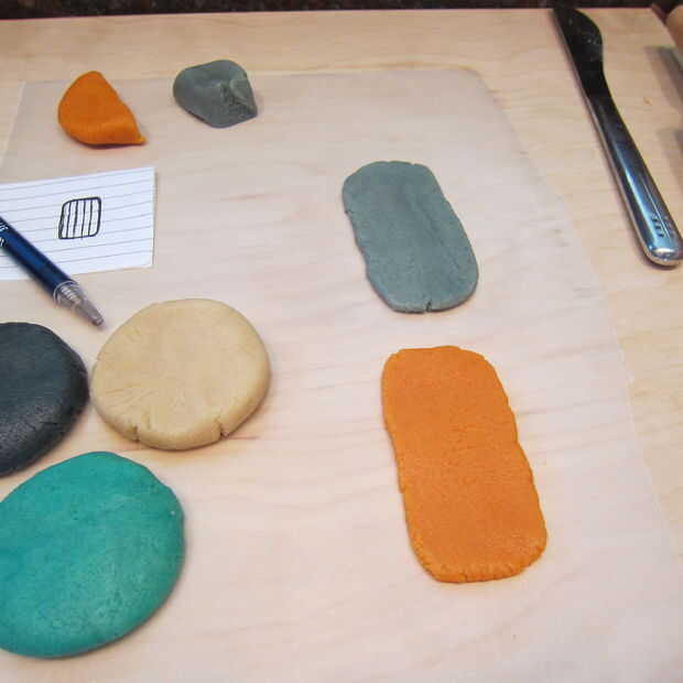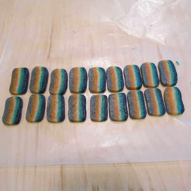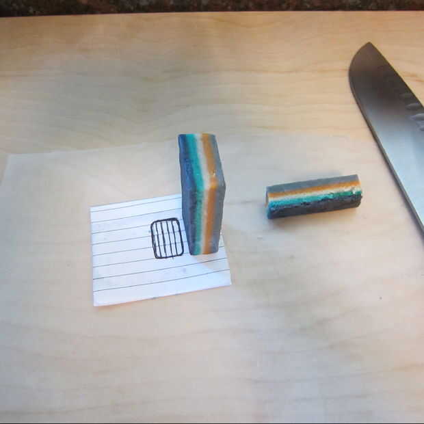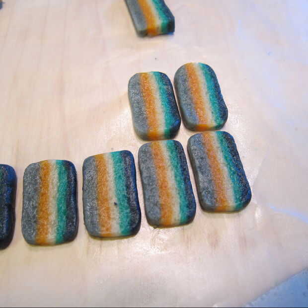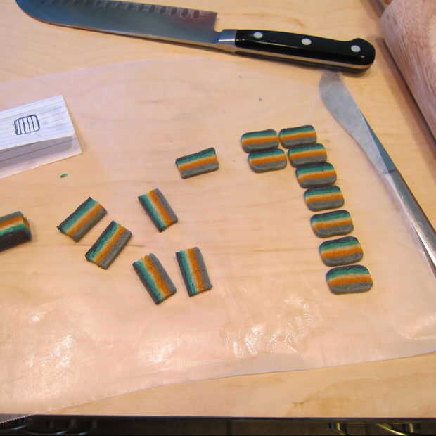 Coloque la masa en el refrigerador o congelador a firma para arriba. Una vez que la masa es firme, corte 1/8 pulgada rodajas Redondeando los bordes con los dedos un poco y coloque sobre papel encerado.
