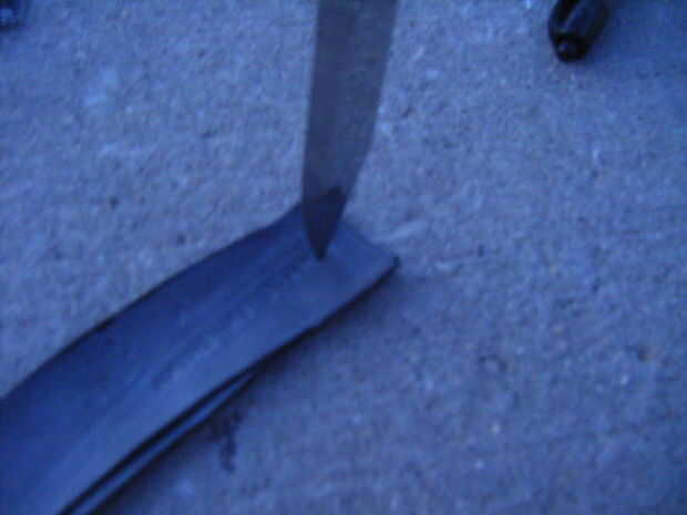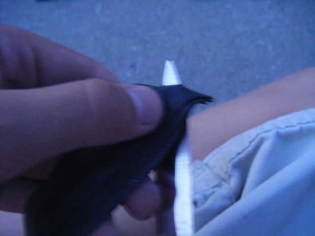 hacer 3 agujeros usando el cuchillo como se muestra en fotos, luego empuje algo (perno) a través de los agujeros para sostener los 3 juntos. una vez ligadas, abrazadera o pídale a alguien que sostenga ese fin. Cuando afianzado con abrazadera, empezar a trenzar los extremos really(!) firmemente.