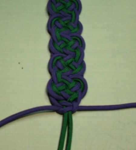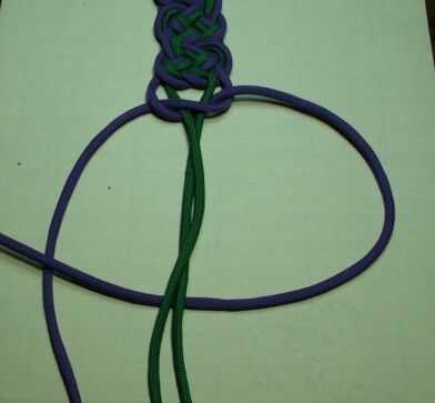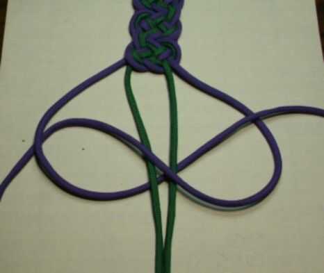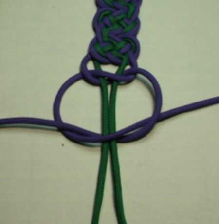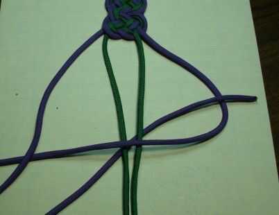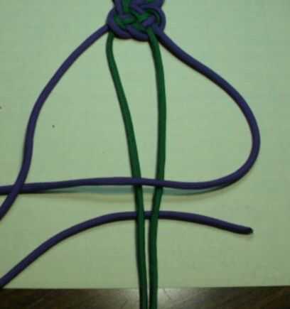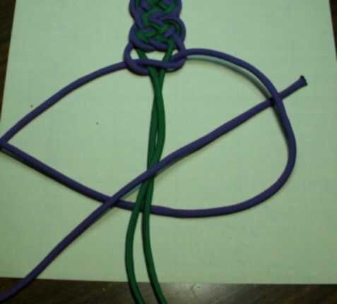 usando los mismo cables de color comenzó con, hacer otro cuadrado a la misma como en la parte superior del nudo. El cable de mano derecha por encima de las cuerdas del centro y debajo el izquierdo.