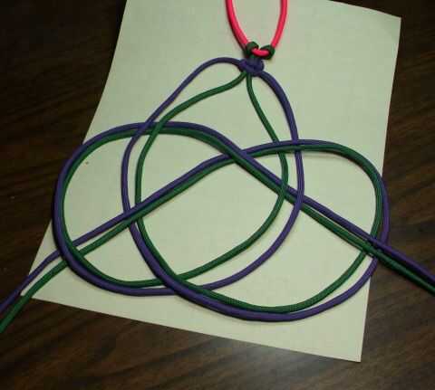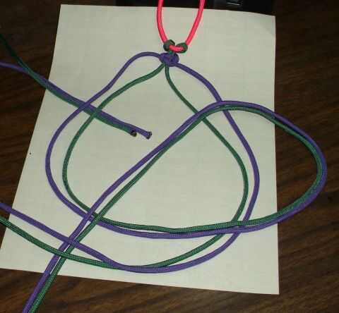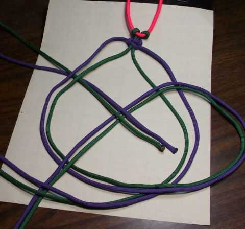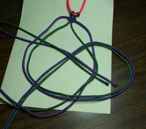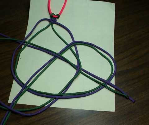Permite echar un vistazo a la configuración. El lazo de la mano izquierda pasa sobre la derecha en dos lugares. Pasa también sobre sí mismo. Vamos a ser tejer las cuerdas de la mano derecha sobre y debajo de una manera que bloqueará todos los cables en su lugar.