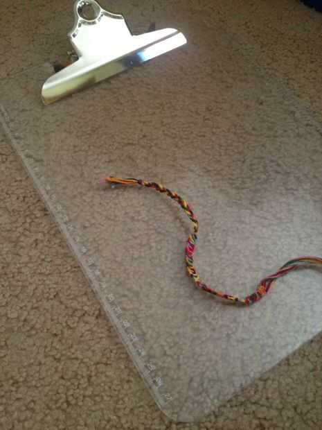 esto es como hacer una pulsera de la amistad peruano onda. Se necesita: 1. 3 o más colores de cadena 2. Tijeras 3. Gruesa cadena a nudo en 4. PortapapelesPaso 1: Cortar la cadenaCortar cadena gruesa 1 la longitud de su brazo. Corte 1 cadena de un col