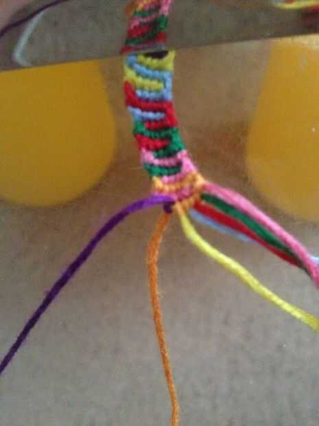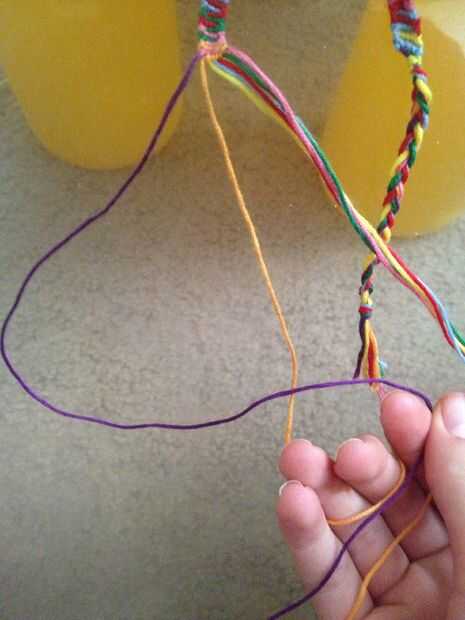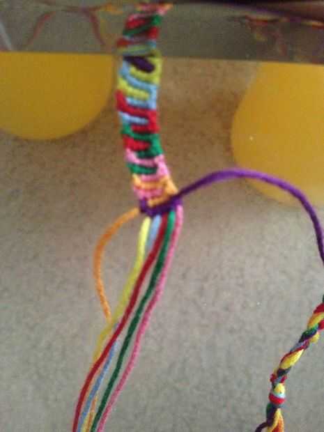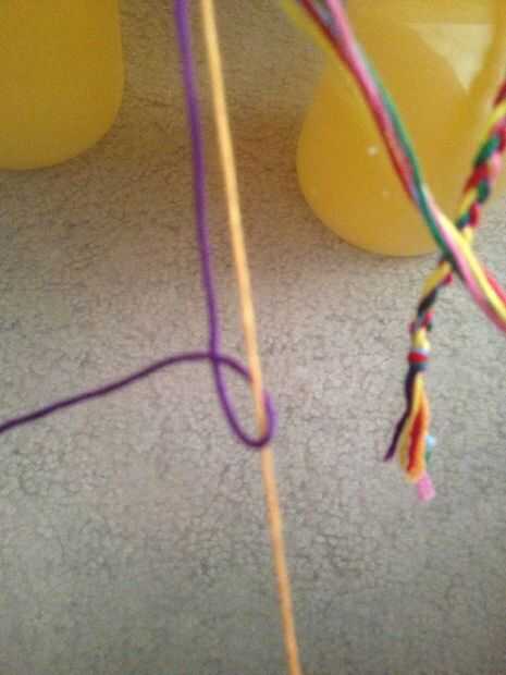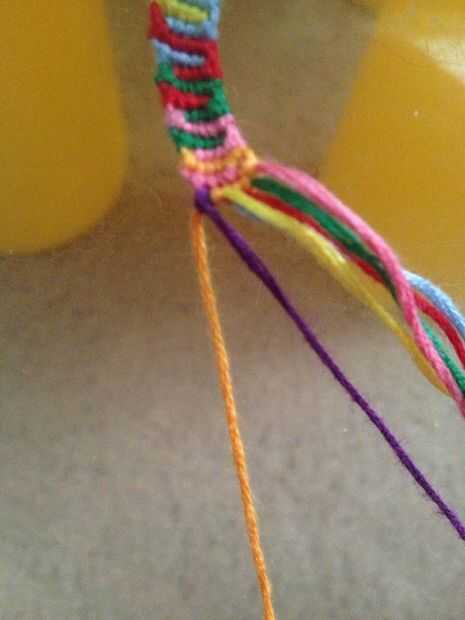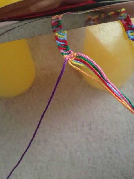 una pulsera bastante sencillo que sólo requiere 1 nudo. Utilicé 4 colores (1 azul, rojo 2, naranja 3, amarillo 4) pero se puede elegir en cualquier lugar entre 3-8 colores.Materiales que necesitas:-Cadena (a veces llamada seda en tiendas de artesaní