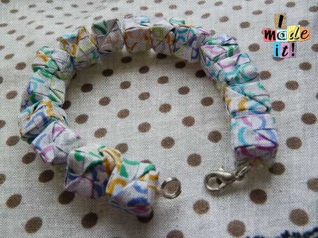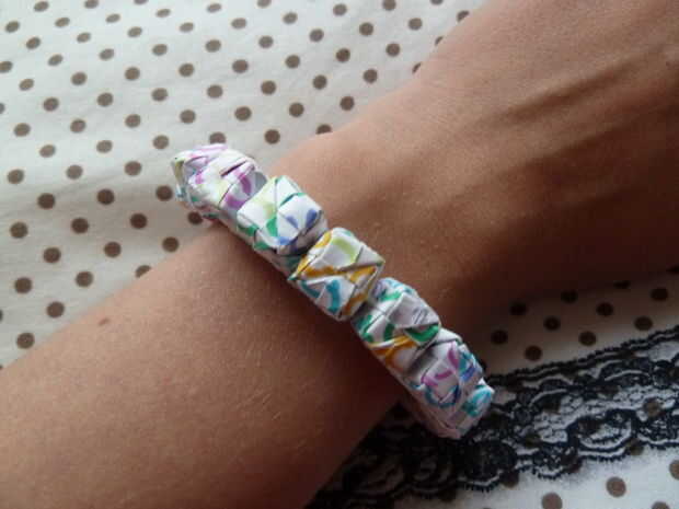 Primero hice una pulsera con cuadrados de origami hace un tiempo, pero era diferente a este. Las plazas se dio vuelta y Unidas por una cadena. Después se rompió (la cadena quebró), quería hacer uno nuevo, pero no exactamente lo mismo. Finalmente se m