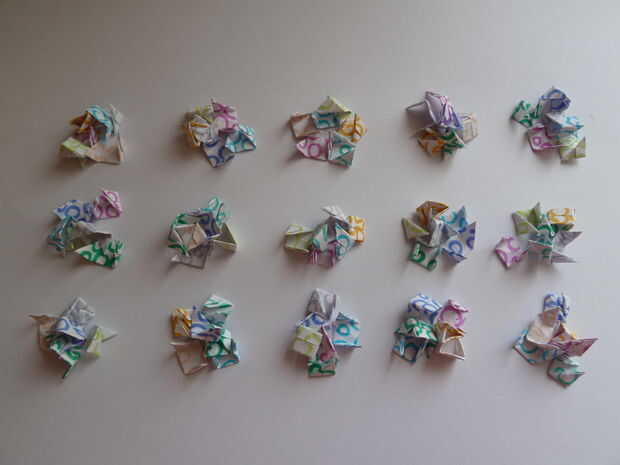 Primero hice una pulsera con cuadrados de origami hace un tiempo, pero era diferente a este. Las plazas se dio vuelta y Unidas por una cadena. Después se rompió (la cadena quebró), quería hacer uno nuevo, pero no exactamente lo mismo. Finalmente se m