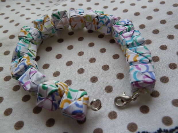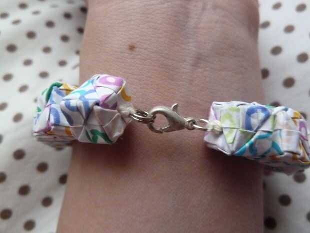 Primero hice una pulsera con cuadrados de origami hace un tiempo, pero era diferente a este. Las plazas se dio vuelta y Unidas por una cadena. Después se rompió (la cadena quebró), quería hacer uno nuevo, pero no exactamente lo mismo. Finalmente se m