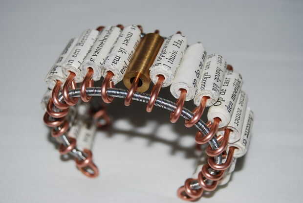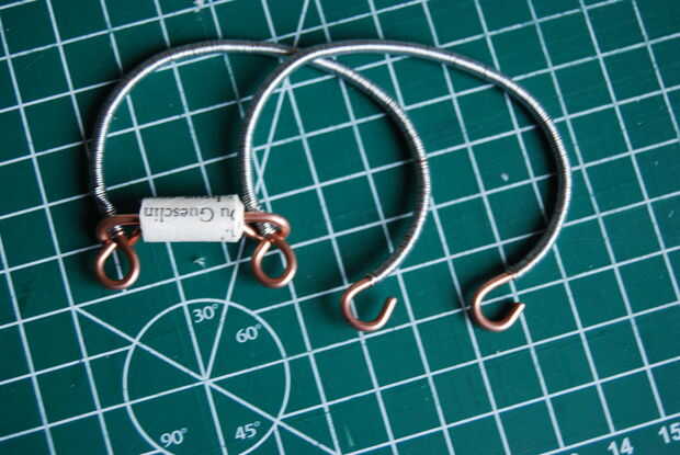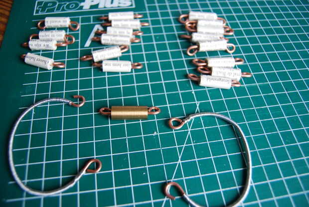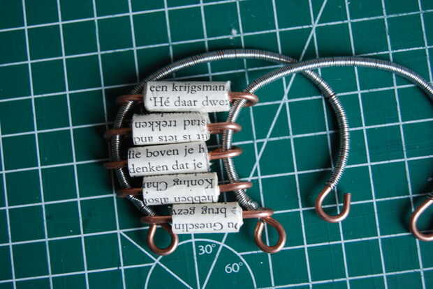 Coloque el dos omega formas al lado del otro y deslice un rollo de papel del lado de los lazos abiertos sobre las formas de omega. Coloque 9 rollos de papel, una varilla de latón y luego 9 rollos de papel.